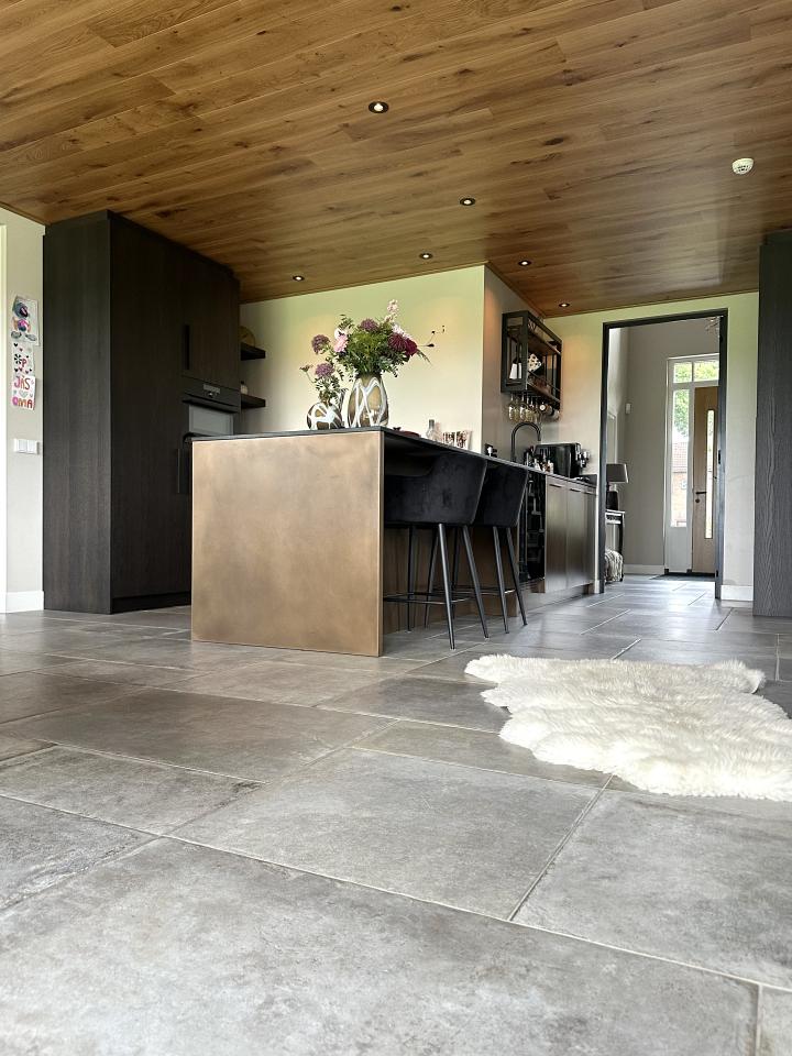 De Loft Warm Grey is een vloer met bruine tinten met een grijze ondertoon. Dit zorgt voor een veelzijdige vloer die eindeloos te combineren is. De klant heeft hier prachtig op ingespeeld met een roestkleurige keuken.